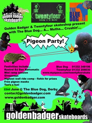 Proper madness is planned by the boys at www.goldenbadger.com for there Pigeon party skate jam that takes place on june 22nd at the Blue Dog in Derby.