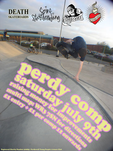 There’s nothing like a local contest to support the scene in the summer. If you live in the area, or feel like making the trek, the skaters at Perdy will be holding a comp for over and under 16’s with loads of prizes (kindly supplied by A Third Foot, Death Skateboards, Spine Skateboarding and Gnargore) and malarkey on July 9th from 11am onwards. All the money raised will go towards renovating the already existing park. Good stuff!