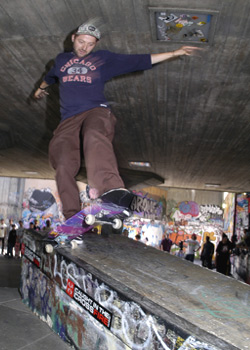 But with some luck and some skill, Enjoi rider Richard Flude managed to crack open his virgin Crossfire account with a kick flip nose pick from the bank to the cheese stub whilst Element rider Lucien Clarke tried to get his steez down. Seth Curtis (pic) grabbed a wallie 5-0 and Chris Oliver pushed for a nose grind dropping deep into the banks on the other side. He managed one but the crowd judged today and deemed Flude the winner, even though Australian Quiksilver rider Josh Roullion’s backside tail stall to bigspin into the bank and frontside nosegrind revert into the bank missed the cash. One thing I would like to point out is that Louie Barletta was skating this block and hucked a wonderful wallie lip slide on it before the jam kicked off…you try that one next time you are there…wonderful line.