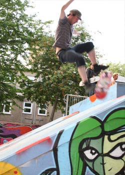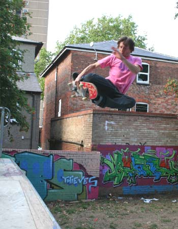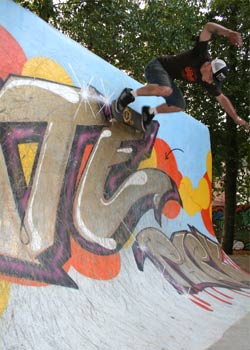 The concrete mini ramp is quite fast and a good size with escalators included for your session. Heathen Skateboards rider Colin Adams (pic left) seemed to shred the coping faster than any other human being whilst we were there, seriously, it was fucking insane!