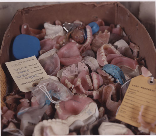 This is a photo I shot in the lost property section of the London Underground beneath Baker Street Station. It is taken from a photographic project I made there called “Cinderella Moments“, a series of still lives of all the stuff that people lose on the tube. One of the staff down there explained to me that the only way people can tell if the teeth are theirs or not is by trying them on and that’s what inspired me to shoot this photo. Nasty stuff…
