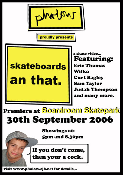 Support your scene and get down to the premiere of Pholow Skateboards An That the brand new video from Leicester skaters Eric Thomas, Judah Thompson, Wilko, Curt Bagley and Sam Taylor. The action takes place at the Boardroom Skatepark on Saturday 30th September at 8.30pm.