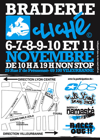 This news is only interesting for those of you that live in Lyon, or are thinking of passing through there between the 6th to 11th November. Cliché are holding their annual sale where good deals are the order of the day. In association with four Lyon skateshops (Wall Street, ABS, Namasté and Ballz Out!), make your way over to Cliché HQ and pick up a board, sweatshirt, jeans or socks for half the price.