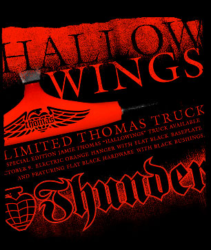 Seeing as the Pro-model truck is here to stay, the trend setters that are Thunder have decided to release two new models that will easily match your Halloween costumes come October 31st. First off is the limited edition Jaime Thomas Hallowings truck, that comes in electric orange and flat black. Then, you can try out the brand new Erik Ellington Nightvision truck that comes in all metallic black with fog-grey bushings. Scary…