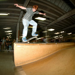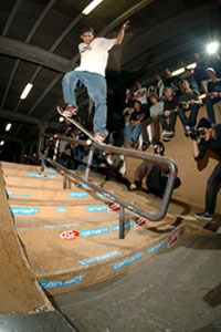The course was quickly cleared of any lemmings and the show began. I could tell the locals had been waiting for this event because even parents and girlfriends got invited! I can imagine the invitation now: “Darling, the club scene is so passé these days. Why don’t we try out the adrenaline fulled confines of an unheated skatepark tonight..? Why of course, honey! Let me fetch my wax!” Zumiez didn’t need to pay the gas bill this month because Nike SB turned up the heat, and a few hundred sweaty college boys doesn’t go cold after 5 minutes of muscular strain. Trust me.