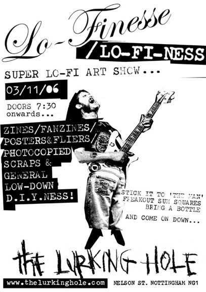 The Lurking Hole has been throwing shows, exhibitions and other random malarkey every weekend for the last couple of months, so tonight is no exception. Get your glad rags on for a Lo:finess-Lofi:ness art show. Doors open at 7.30pm Nelson Street Nottingham NG1.