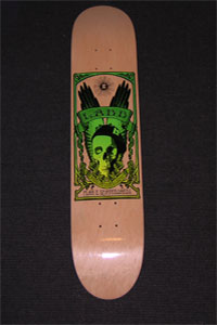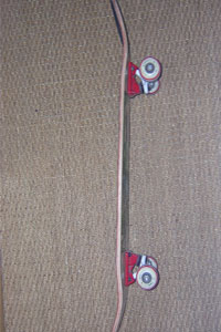 Finally, the finish of this Plan B board is clean as a whistle. Smooth carpentry on the rails, and a jazzy twist on the old skull and crossbones graphic. I had to take a picture of it because the top surface of this deck is printed from top to bottom with each rider’s skull and banner. So, like I said, the finish on this deck is clean. Hell, the varnish even slides without sticking or flaking off.