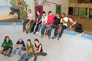 With a short respite for group photos, the session quickly resumed. Emma landed a couple of backside 50-50’s on the ledge and smiths on the bowl. She definitely would have won the competition for the best dressed, with her waistcoat-come-t-shirt from the Clothes Show Live?!? Becky and Laura pulled out a combination of flips between them on the bank – fakie-shuv flips, fakie flips, backside and frontside flips etc etc – there was no end to their technical wizardry! Becky however on one landing, slammed pretty hard falling from one block to another on the sharp edged coping. Everyone winced at the broken ribs scenario but thankfully she got up laughing.