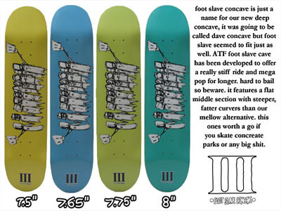 Skateboards today are manufactured by only a handful of factories- most of which are bickering over scraps since the fantastic Chinese Manufacturing Coup- so it’s surprising to hear about an outfit in Britain that does it too. A Third Foot was the brainchild of Ken and Joel who have worked long, hard hours since 1997 to bring top-notch product onto the market. Understand that ATF is a hands down unit that prefers quality over quantity when they follow a skateboard process from 7 raw plies to a finished product. The team consists of Kris Vile, Ben Blake, Tom Brown, James Woodley, Rich Lewis, Norm, Bob Sanderson and Damon Levanthal.