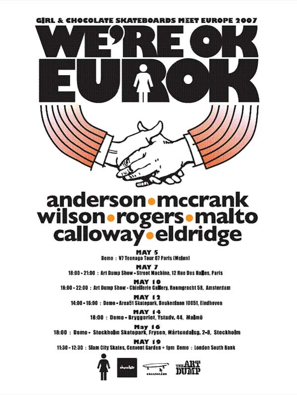 It does what it says on the tin, here’s the flyer for Girl Skateboards and Chocolate Skateboards forthcoming visit with May 19th scheduled for a demo at Southbank in London after a signing sesh at Slam City Skates.