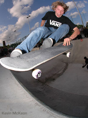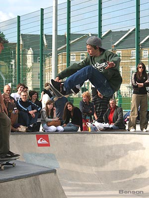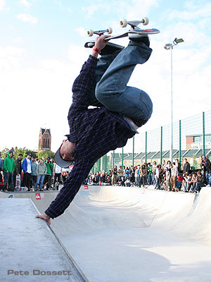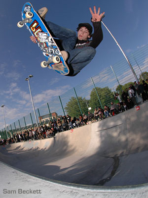 Crossfire Clothing rider Kevin McKeon was picked in a deserved 2nd place with firm, bolshi lines that included lien tails, back lips, bonelesses, airs, cradle burn and transfers but he must have just nicked his spot from Sam Beckett who came 3rd. Sam is a Globe sponsored rider who has cleaned up on most vert jams over the last year. His attitude to skating is second to none and his endless trick rate can leave you stunned. He pulled a kickflip fakie off the vert extention and so much more it’s a joke. The UK has a hidden talent here that is about to be unleashed to the rest of the world, watch this guy fly in the next year or so.