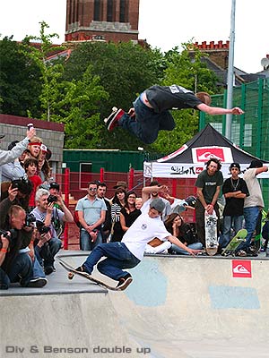 Scottish skater Benson proved he is yet another face that the scene will be seeing more of alongside his travel buddy Div Adams. The mohawked ginger machine ate this park for brreakfast and then washed it down with Motorhead as his request at the after party. He deservedly won the best trick comp with an ollie over the roll in to FS Five 0 on the vert wall and then backside disastered the cradle! Napalm Jeff will be stoked. Sickness..