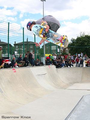 A session from Quiksilver riders Daniel Cardone and Javier Mendizibal went down well with the crowd. Cardone really knows how to fly, no wonder Christian Hosoi has a vested interest in his wings. Awadh Mohammed was back for more once again. His technical prowess is building perfectly as he gets older, expect his steez to rise further this year. Brighton’s Stevie Thompson was also amongst the names on everyones lips with a sick beanplant on the cradle and his usual self styled madness on a board. He was joined by Sparrow Knox who has a mean backside air. UK skate legend Pete Dossett still rules the coping with his hands and his trucks. It’s always amazing to see him ride transition with his grace. Sorry to leave others out here but many more local up and comers from the UK who skated this place to death made this event just as special as those who have been mentioned above. It was a great day out for everyone not to mention the running commentary from Big Bob – Birmingham’s finest.
