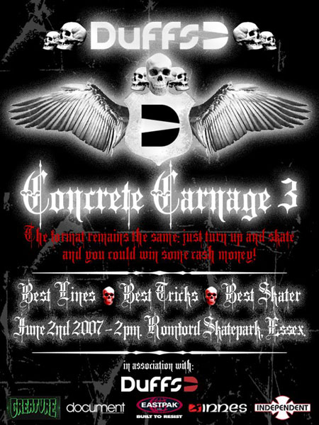 Romford will be buzzing all day Saturday with the return of Concrete Carnage. Expect hesh sesh that goes to 11, fuelled by Iron Maiden and plenty of back lip action from the UK Duffs squad.