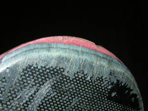 The Uberlight gets it’s name from the advanced board construction that incorporates thin layers of ply sealed with epoxy glue and a back bone of carbonite that runs through the heart of the deck from nose to tail. What this stretch of carbon does if keep the weight down and the response up. Strength, pop and rigidity are key words involved in this futuristic design. And it works.