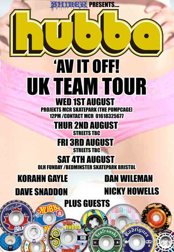 The UK Hubba Wheel Team will be zooming around the UK in a van looking for girls in leopard skin bra’s this August kicking off on Wednesday 1st at Projeckts in Manchester onwards.