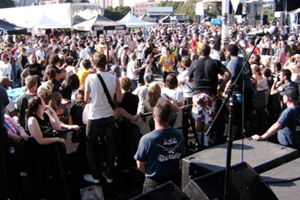 Getting to an already packed out queue to go into an enormous car park at the baseball stadium of the Twins in the blazine heat wasn’t my idea of fun. However, a quick phonecall later and my guestlist wristband was letting me jump infront of huge numbers of emo-by-numbers kids and straight into the shade.