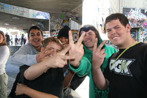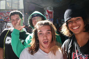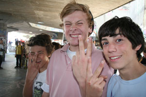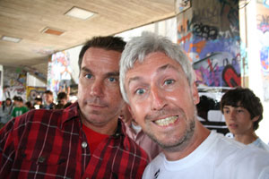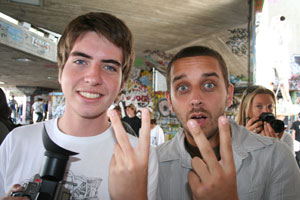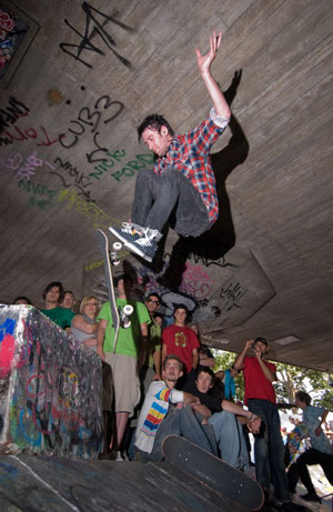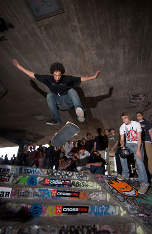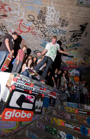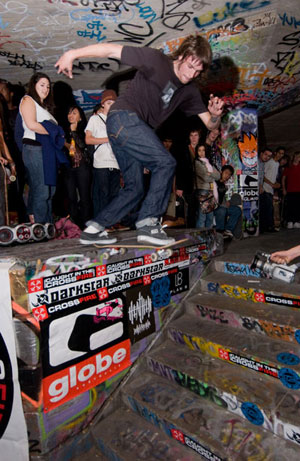 After the warm-up lemmings got their legs ready to go on the stairs, proceedings started on the banks and cheeseblock, which got cut, crumbled, melted and turned into Welsh rarebit within half an hour. I have never seen so many tricks go down on the awkward haggard setup. Heroin’s Chris Ault went all out and knocked out about 10 tricks in a minute with axle stall 270s and frontside nosepicks. Local lad Robin Lambert blue-legginged his way through blunt 180s and a beautiful blunt bigspin back into the bank, Cramps t-shirt duly noted. But Blind’s own Kris Vile ended it with a kickflip blunt 180 to bag himself a fifty-sheet, and leaving the circus entertainers on stilts in sheer amazement. Props to Vaughan Baker as well as he bluntstall kickflip fakied the block o’fromage, which almost no-one saw. Vaughan (below right) is still one the UK’s sickest skaters.