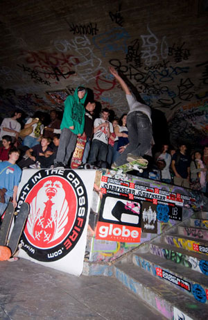 Darkstar’s Adam Dyet threw down switch backside 180s, nollie cabs and finally a nollie cab heelflip down the old girl and won himself some cash. Terell Robinson spun his green dreadlocks though a massive backside 360 like the Incredible Hulk at a disco, whilst Marley switch tre flipped all day. Chris Ault and Robin got the crowds going with some double backside grab action at the speed of light, those guys seriously tank it! Craig Smedley quietly got on and did his ultra smooth thing with switch frontside kickflips like buttered icecubes. Whilst many a 360flip and hardflip was smacked into bare concrete by the assembled hammer heroes, Kris Vile blew everyone else away and barely hung onto his backside 360 kickflip to bag yet another 1st place and another cash splurge into his hands.