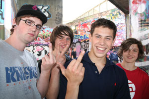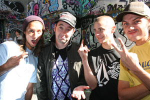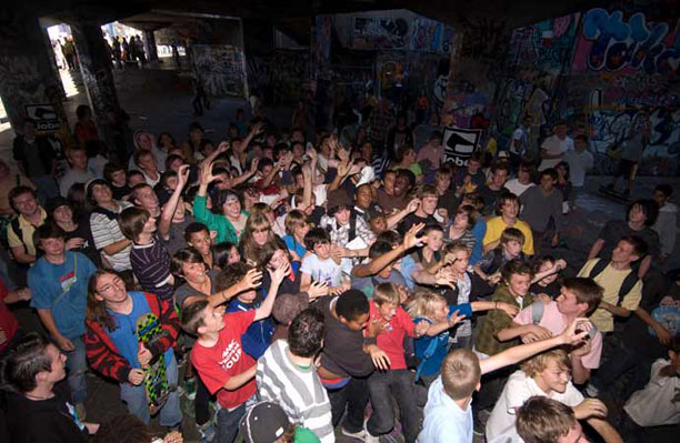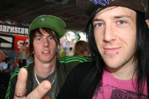 Blueprint’s Neil Smith rocked up and did switch nosebluntslides into the crowds, who went ballistic until Slayer were silenced on the Crossfire sound system. Smiffy also took a nasty slam that would have made your bollocks retract into your stomach trying to nollieflip crook the pirate’s plank, into a sea of piranha kids. Hobbling off to a round of applause, he’ll be back. But the top spot was nabbed by Adam Dyet who took home the 1st prize cash for his perfect kickflip frontside noseslide, which he got on so far out we all thought he’d overcooked it. But no, the money was pocketed and it was time for the kids to bite each other’s faces off for stickers, t-shirts and decks. All I have to say about the product toss was that the little squealing pig kid needed a punch in the neck, and don’t ever let kids know that there are free posters left in a box by your feet, otherwise you come away with bite marks on your ankles.