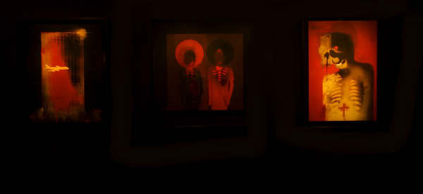 The art itself definitely has an eerie feel, the boldly blacked out gallery adds to Robert Del Najas (aka 3D) blurring of the relationship between silhouette and shadow. The imagery is tweaked to haunting proportions, creating lasting impressions of skeletal figures staring out desperately lost in warzones and terror carnage.