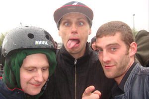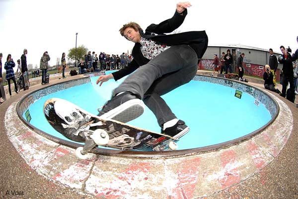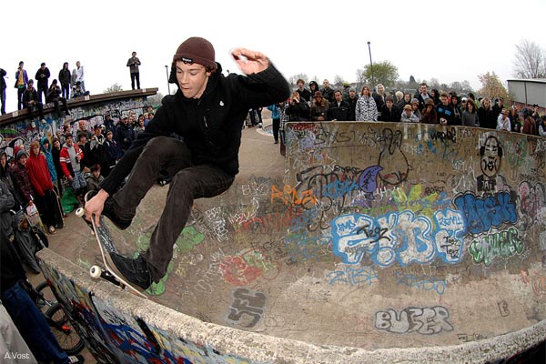 The BaySixty6 local got to work on the infamous ‘Bollocks’ with a flip frontside air in front of a packed, frozen crowd. For those of you who are wondering what the ‘Bollocks’ actually are, they are the legendary hips at the bottom of the park that have been sessioned for years. His kick flip frontside air over the nads secured some cash and warmed the hands of most. Dan Cates decided that 3 boards stuck together was far more exciting to ride than one today and his unique style combined of tech skills and total fun provided light entertainment.
