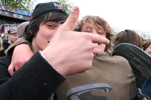 The concrete half pipe got a roasting on the day thanks to a sick front blunt from Carl Wilson. The Death Skateboards rider laid down a bunch of tail slides and took his prize well. The last time this trick at this spot was covered internationally (TWS cover 1992) it was Mike Frazier who had the balls to huck one into the pit of doom. This half pipe is a gnarly ride but it didn’t stop Ben Raemers from chucking in wild nosepicks and fast backside disaster reverts despite skating with an injured knee. The session continued even as rain started to spit from above but it didn’t manage to stop people from skating . Funniest moment of the day was when local nutcase ‘Psycho’ Simon ripped off his shirt and pushed himself onto the lip helped by 200 people screaming to help him on from Monk’s loudspeaker pleas!