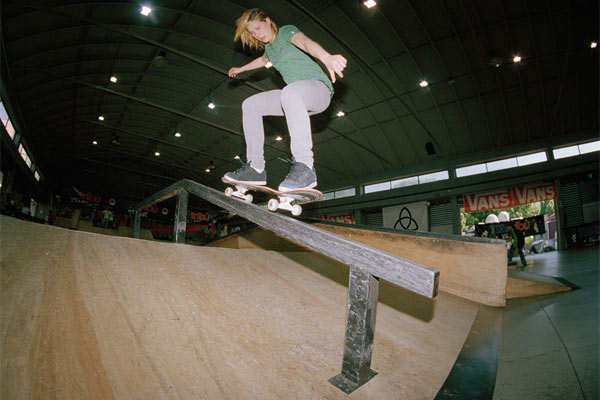 The comp was not split into sections just 11 groups of 3 which were the qualifiers, where sponsored competed against non-sponsored. The groups got to ride together in 3 minute runs, for which they got two attempts at. Highlights of the qualifiers: Lisa Jacob’s kickflip into the steep bank, Andrea Wilshesen nollie impossible’s, Sam Bruce’s 50-50 down the hubba and Sabrina Goggel’s frontside flip over the hip. In the end it was Evelien Boiulliart ‘s and Candy Jacob’s runs which were the most outstanding. Candy landed trick after trick: backside 50-50 down the driveway block, feeble down the rail and ollie from flat bank over the top into the mini ramp. Evelien landed a list of tricks as long as your arm, smith and k down the rail, heel flip up the step gap and f/s 50-50’s to name but a few.