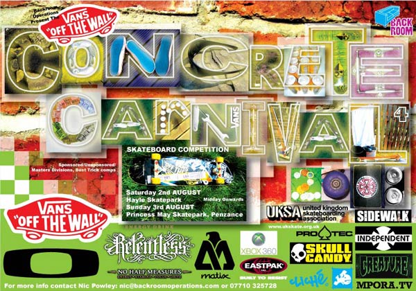 The Vans Concrete Carnival is back and this year will be hitting Hayle Skatepark on 2nd August and Princess May Skatepark, Penzance on Sunday 3rd August. Spread the word.