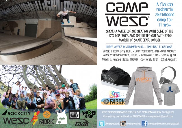 WESC‘s summer camp is back this year so if you want to skate with UK pro’s, learn new tricks, hang out with others and skate away from home and generally have a blast then head over to facebook.com/CampWeSCUK for all the details.