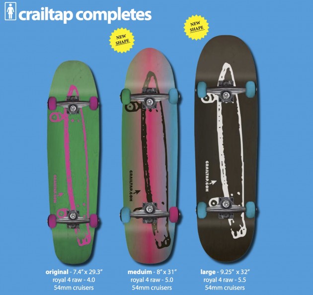 Those cruiser decks are everywhere, but are they looking as good as these? Maybe not. Click play on this beautifully crafted video for the launch of the Crailtap Cruisers that have just been released. They come in Small (7.4” x 29.3”), Medium (8” x 31”) and Large (9.25” x 32”). All come with Royal 4 trucks and 54mm cruiser wheels.