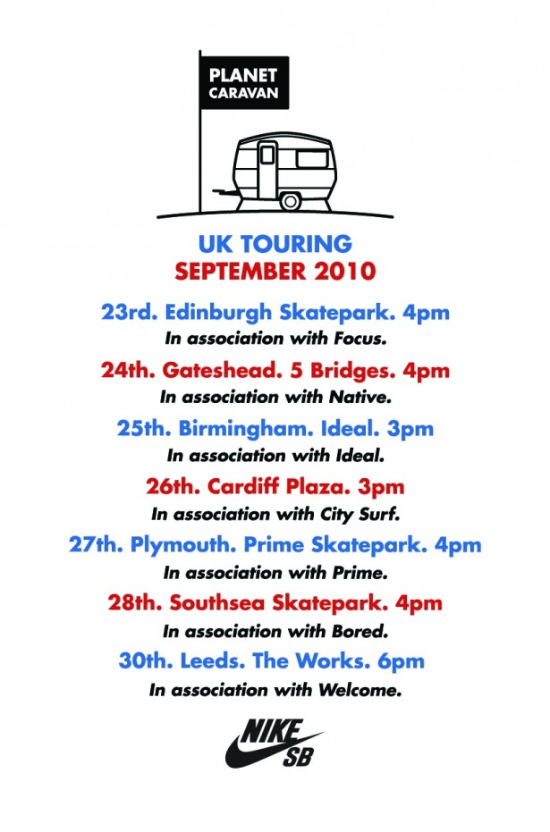 The UK arm of the Nike SB team are set to embark upon what could arguably be described as the last Summer tour of the year. In the last week of September Korahn Gayle, Chris Jones, Neil Smith, Joey Pressey, Snowy, Colin Kennedy, David Mackey, Tom Harrison, Mike Wright and Jerome Campbell will be hitting up the skate parks listed on the flyer below.