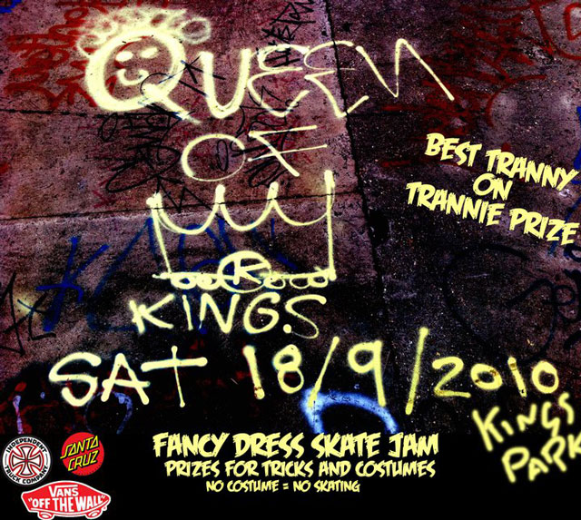 In case you had forgotten, here is a reminder that the fancy dress Queen Of Kings skate jam is happening this weekend on September 18th!