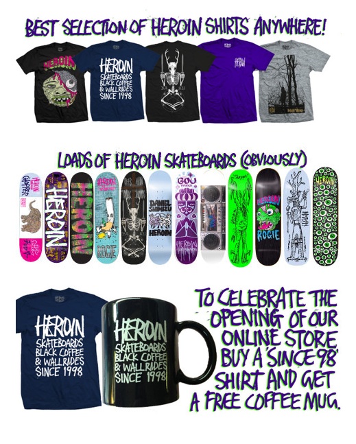 To celebrate a sterling run of decks, wheels, slime-filled graphics and rad skateboarding since 1988, Heroin have launched an online store today where you can pick up all of their new lines for this summer and stuff you may have missed. Find it all here.