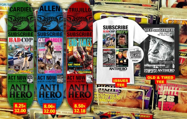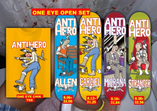 The Eagle has landed for Spring 2013 over at Anti Hero this morning. Check out their new wood series including Issues, One Eye Open, Ooze, Close-Up Pigeon, Grosso’s Eagle Doll collection, Road to Nowhere, Stencil point and classic Eaglez sets here.