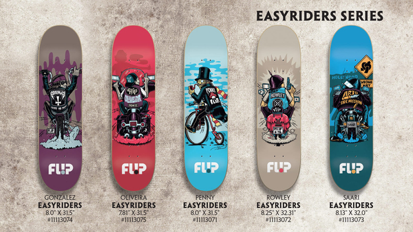 Flip Skateboards have launched their new Easy Riders deck series this week in their new Fall catalogue. The new wood features pro decks for newly announced pro’s Curren Caples and Louie Lopez alongside signature decks for Rowley, Penny, Saari and Oliveira.