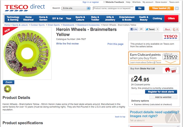 It’s worth us pointing out that Heroin Skateboards do not sell their decks, wheels or anything else via supermarkets like Tesco’s. This is a one off, a surprising find and certainly should not be taken seriously. Pick up these rad wheels at your local skater owned shop and click here for the new Spring catalogue.