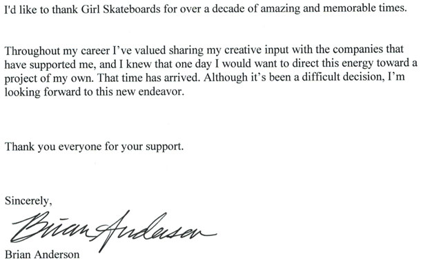 Brian Anderson has handed in his notice at Girl Skateboards overnight as you can see from this press release below. Anderson joins Jason Dill and AVE as seasoned pro’s moving into new territory this year. Only time will tell if these are connected but for now Anderson looks like he is setting up his own ship. We interviewed him back in 2007 that you can revisit here.