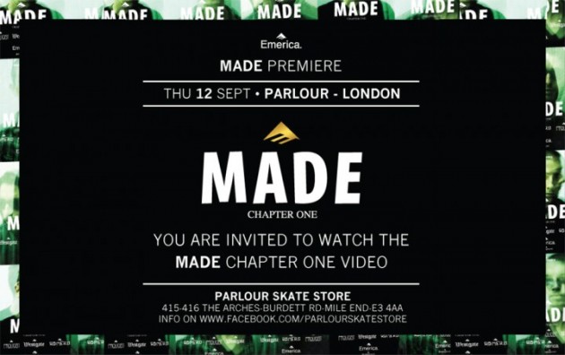 A brand new Emerica video will be premiered this Thursday 12th September at select UK skateshops called ‘MADE‘ featuring new sections from Leo Romero, Collin Provost and Brandon Westgate. Here in London it will premiere at Parlour Skate Shop at Mile End and then be available to download online on the 15th.