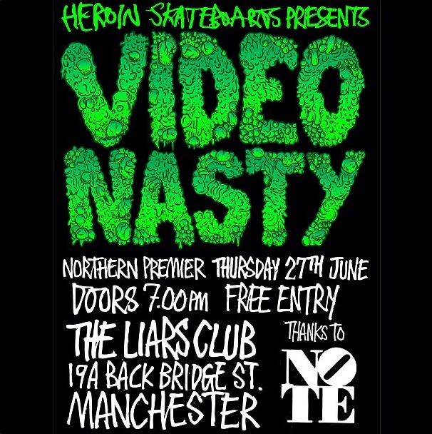 The first UK premiere for the new ‘Video Nasty‘ film from Heroin Skateboards has been announced and will take place in Manchester on the 27th June at the Liars Club, 19a Back Bridge Street. It’s free entry from 7pm and is sure to be a banger. Sort your diary out. Other premiere’s will be announced soon.