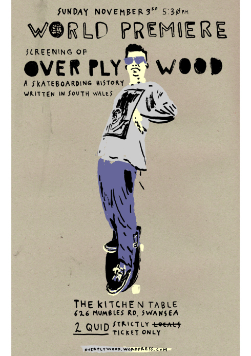 The first screening of Jono Atkinson’s Over Ply Wood documentary featuring the history of the Swansea skate scene will be hosted at the Kitchen Table Cafe in Mumbles on Sunday 3rd November at 5.30pm. There are limited spaces for this screening so get a ticket as soon as you can from Exist Skate Store at 214, Oxford Street, Swansea SA1 3BG. Space is tight in the cafe so entry will be with ticket only.